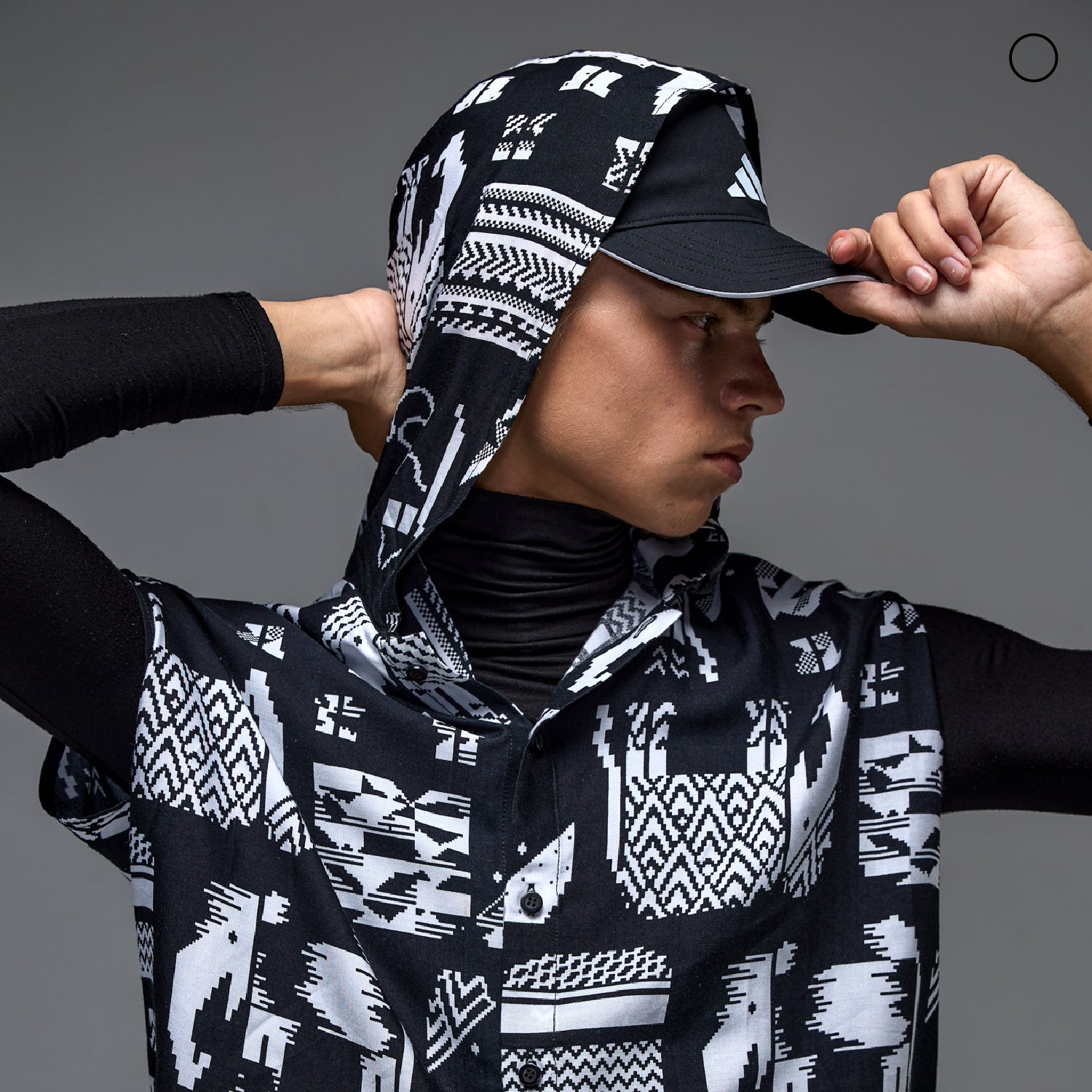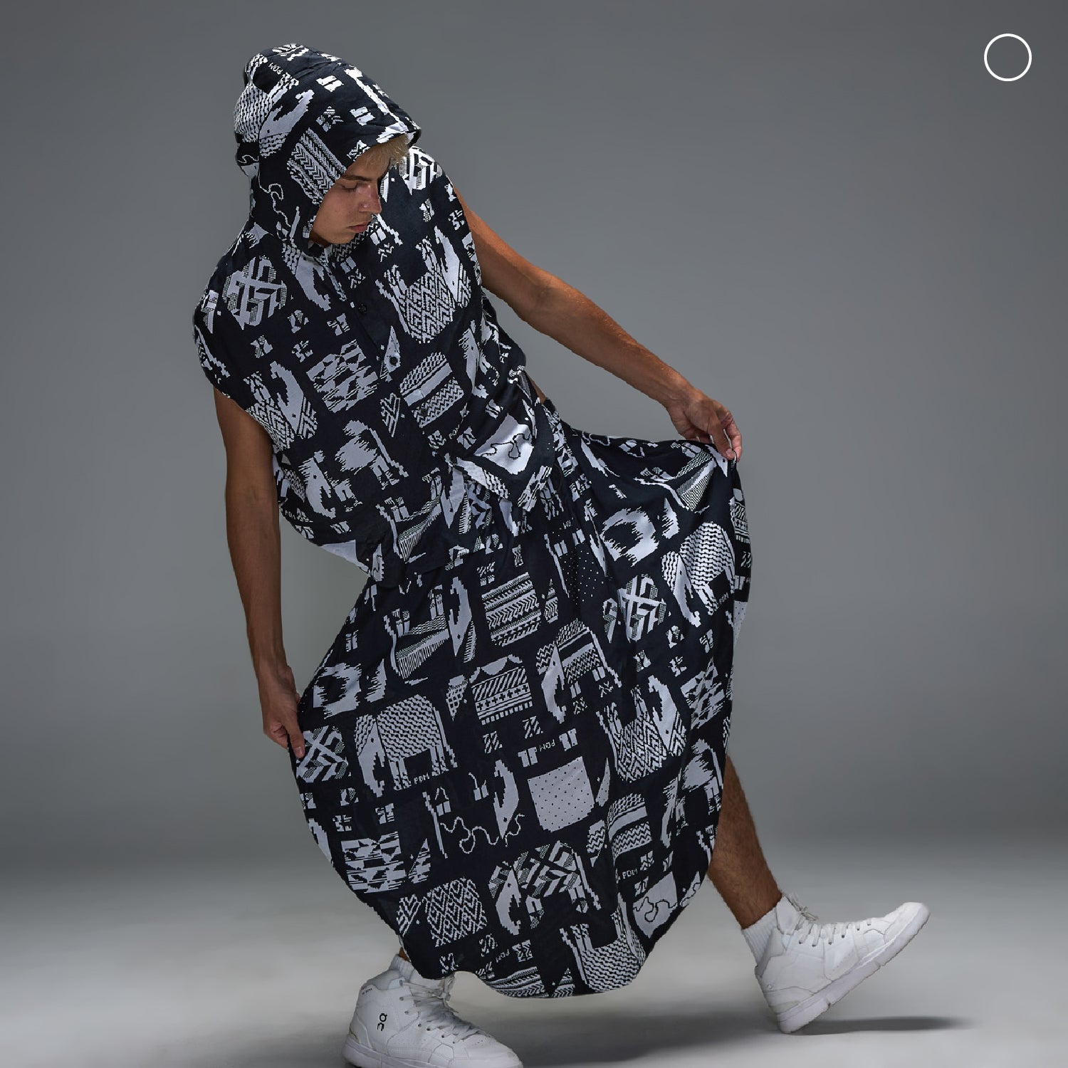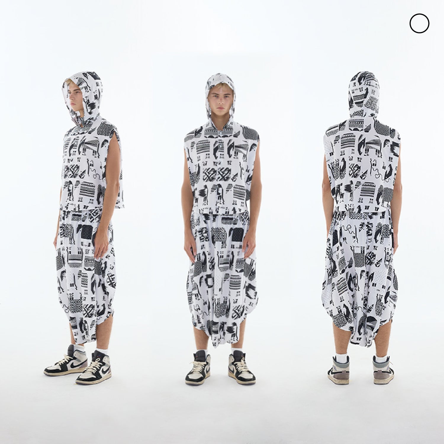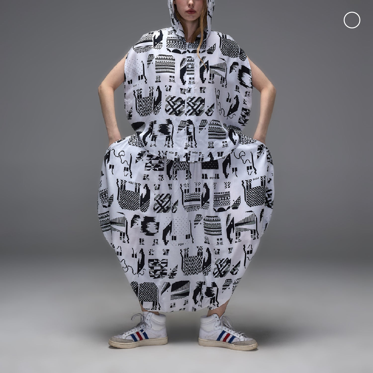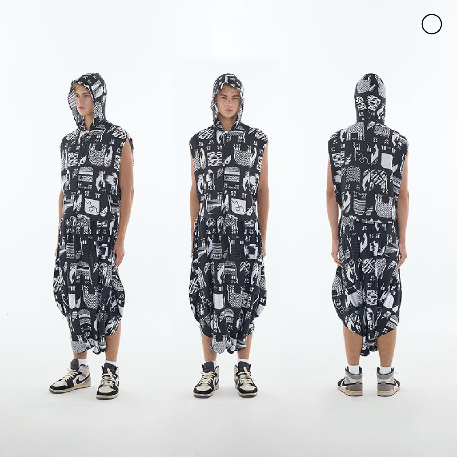 เสื้อ : เสื้อคอปกทรงวงกลมมีฮู้ดและกระดุมผ่าหน้า